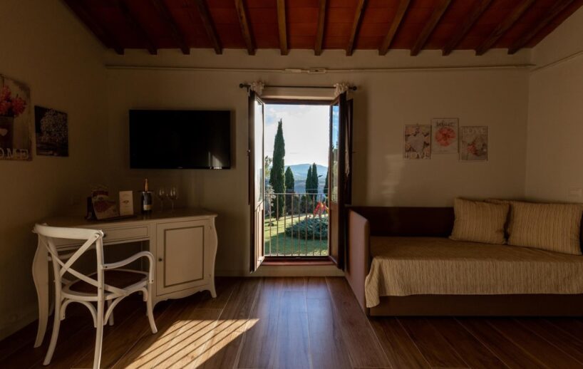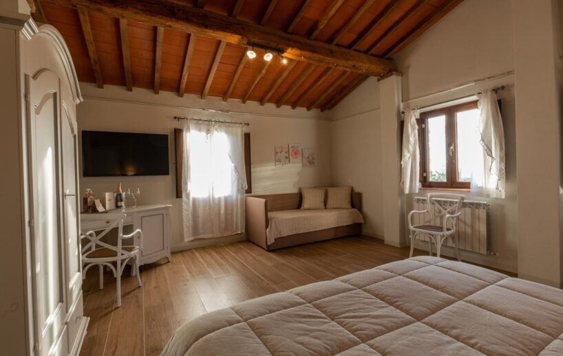 Le nostre camere sono accoglienti e confortevoli in stile tipico toscano con pavimento in cotto e travi a soffitto.